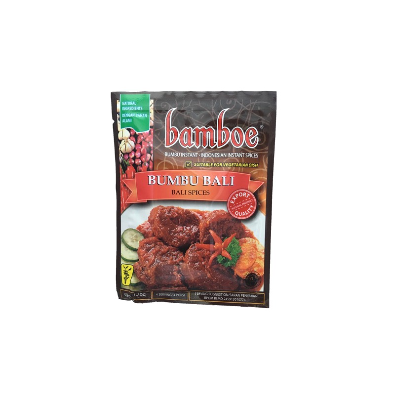 Bumbu Bali - La Préparation d'épices balinaises vous permettra de cuisiner un plat savoureux de bœuf, de volaille, d'oeuf, de poisson. Il est adaptable en plat végétarien avec du tofu et/ou de la pomme de terre. Les ingrédients sont cuits dans le mélange d'épices et avec de la tomate hachée jusqu'à ce que la sauce réduise. A consommer accompagné de riz.